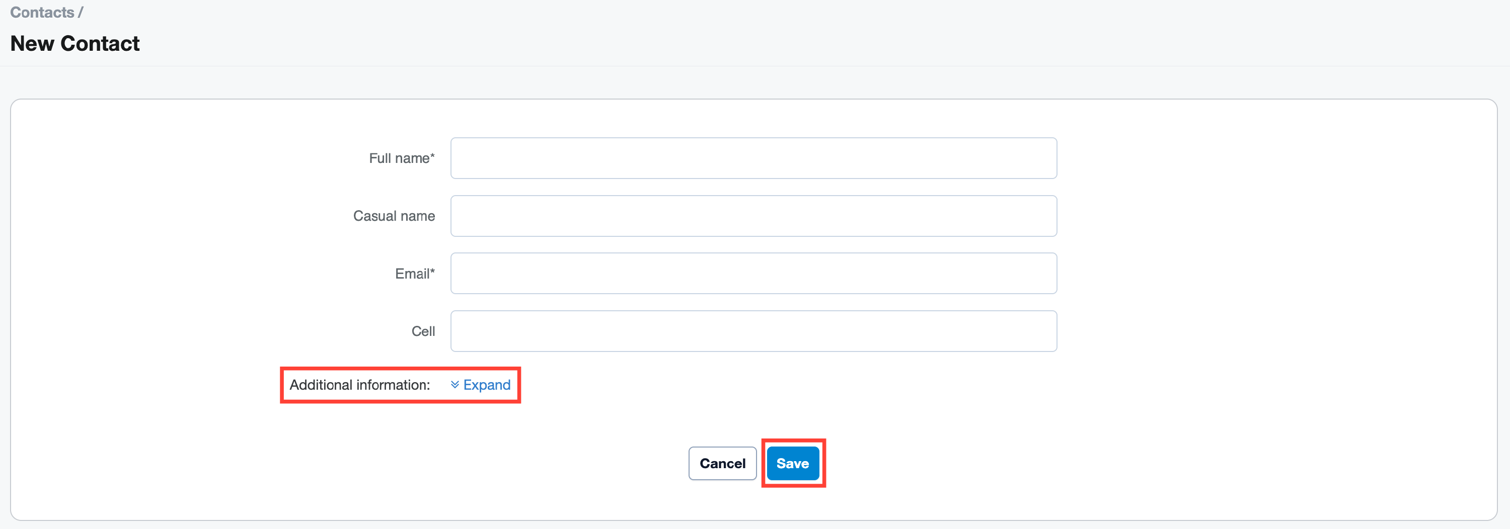- On the New Contact page, enter the user details. Full Name and Email are required fields, all other fields are optional. Expand the Additional information to view other CRM filed information and Tags. Here you can also add Alt. emails (separated by commas). Each of these Alt. emails will be CC'd on all communications that come from the portal except password reset emails.