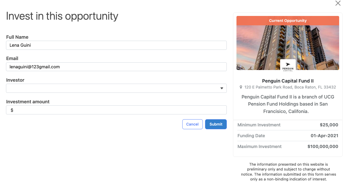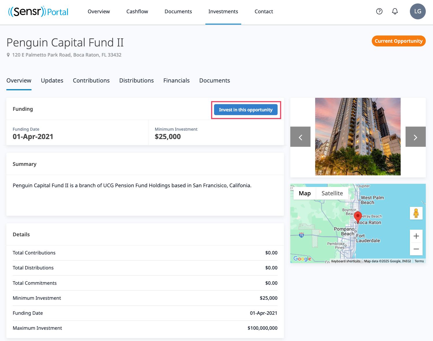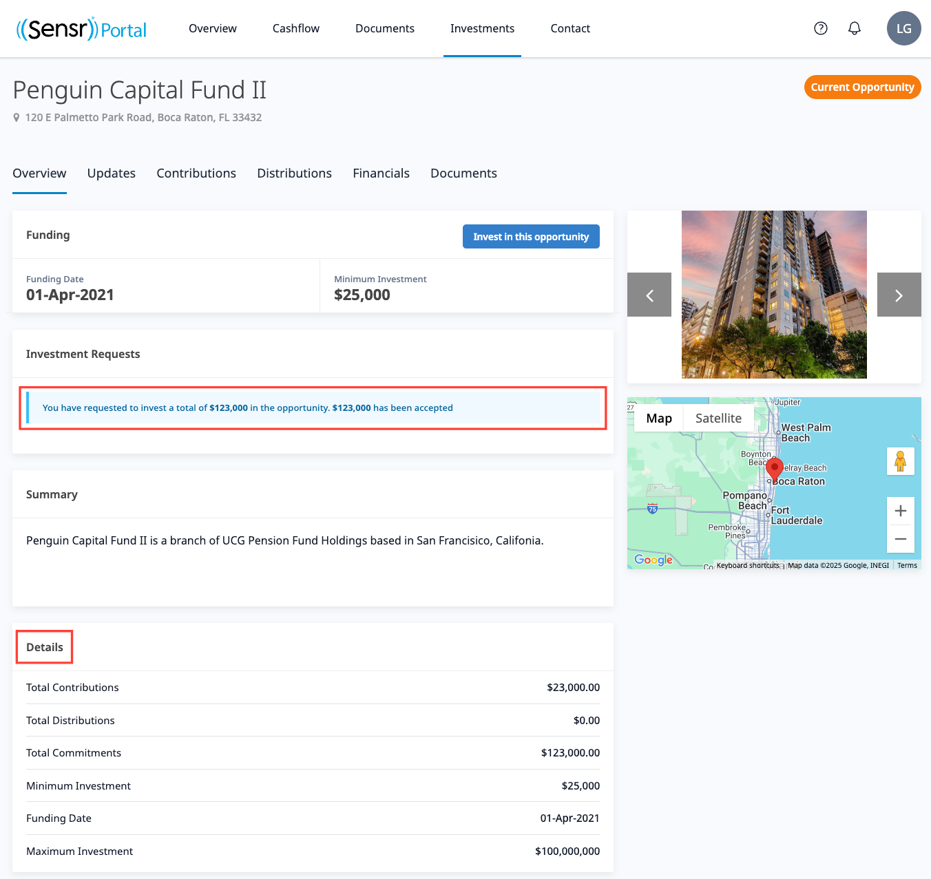 Contacts logged into the portal can navigate to the Investments tab to view a list of current opportunities and select a fund to invest in the opportunity. Below is a contact's point of view where they can request to invest in the opportunity on the related fund page.