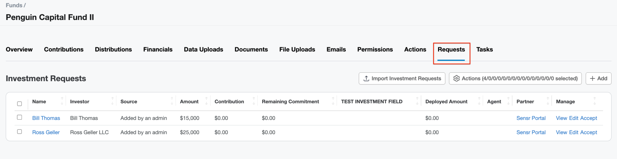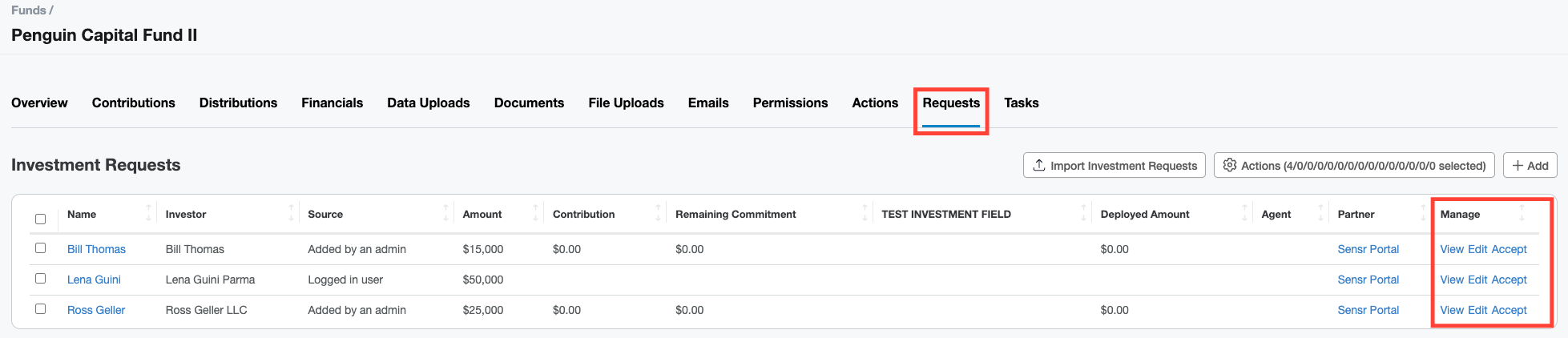 NOTE: Any requests that may come externally from a public minisite will not be put into this list until you create a contact for this external request and assign them to an investor associated to the fund.