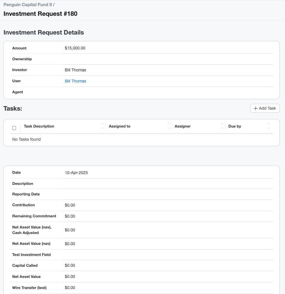 You can use this table to keep track of your investment requests and manually add investment requests on behalf of investors.