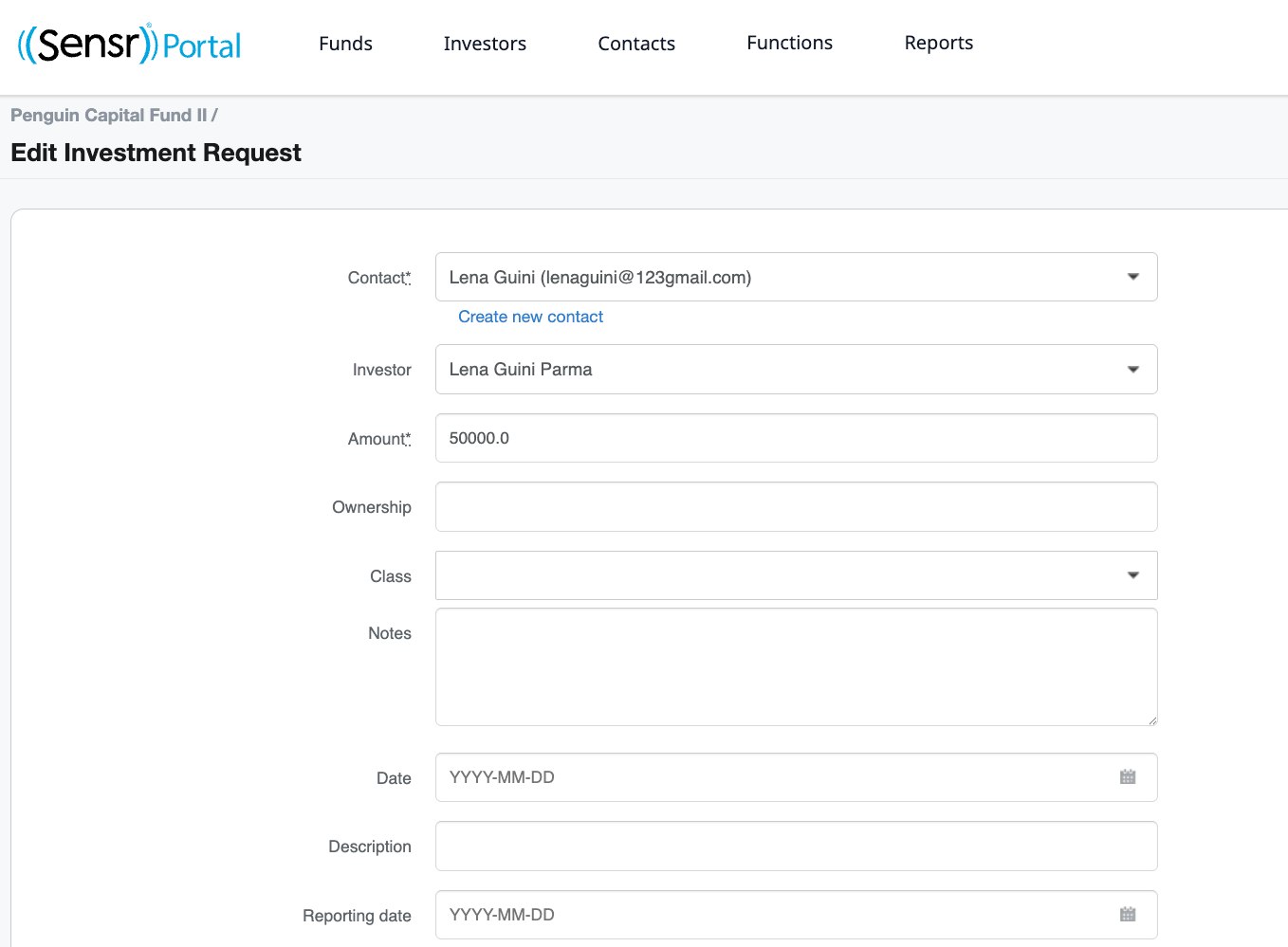 Funds listed as a current opportunity on Sensr Portal offer admins beneficial functionality for managing investment requests.  A new notification appears as soon as an investment request is submitted. Investment Requests are visible on the related Funds Details Page: Requests tab. Here you will see the investment requests compiled from your own entries and requests made by contacts from the portal to invest in this opportunity.