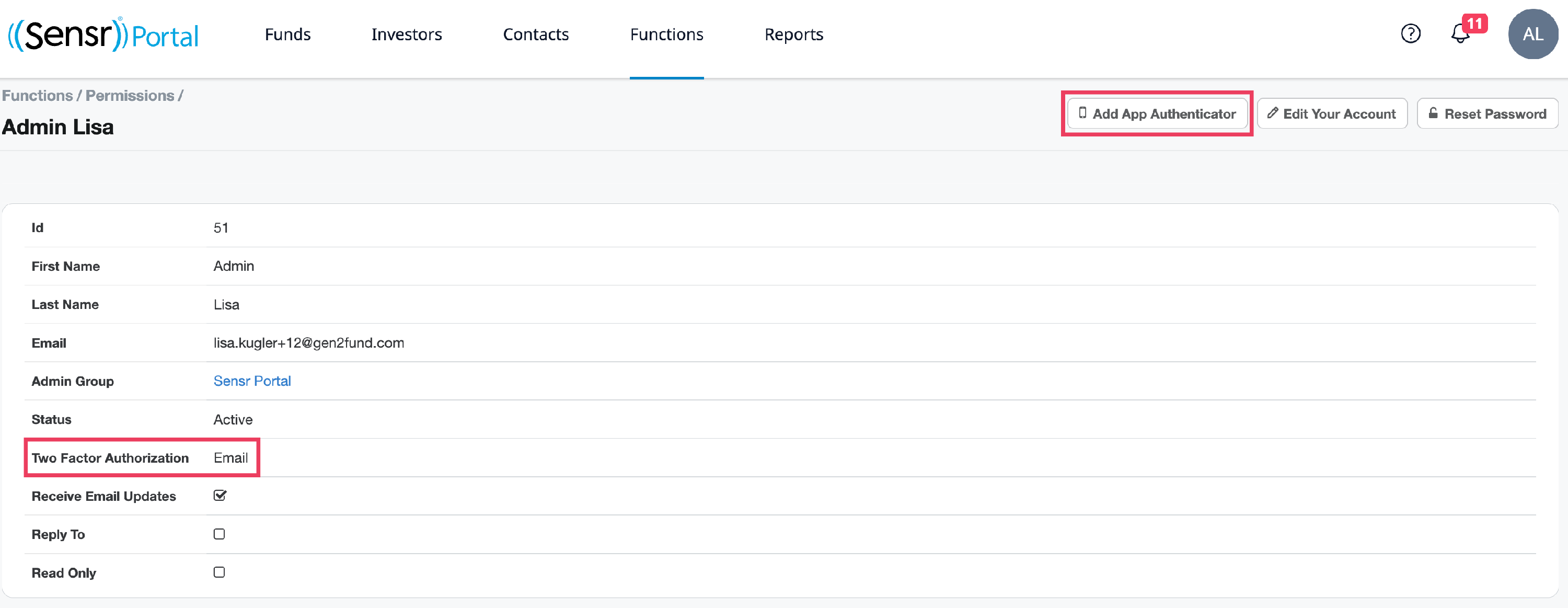 Click the admin name to view the admin details. Notice: Two Factor Authorization is currently set as Email.