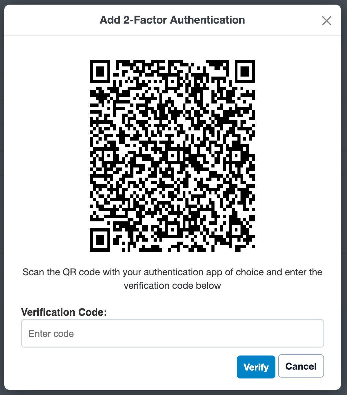 A pop-up appears with a QR code to scan and enter the verification code.