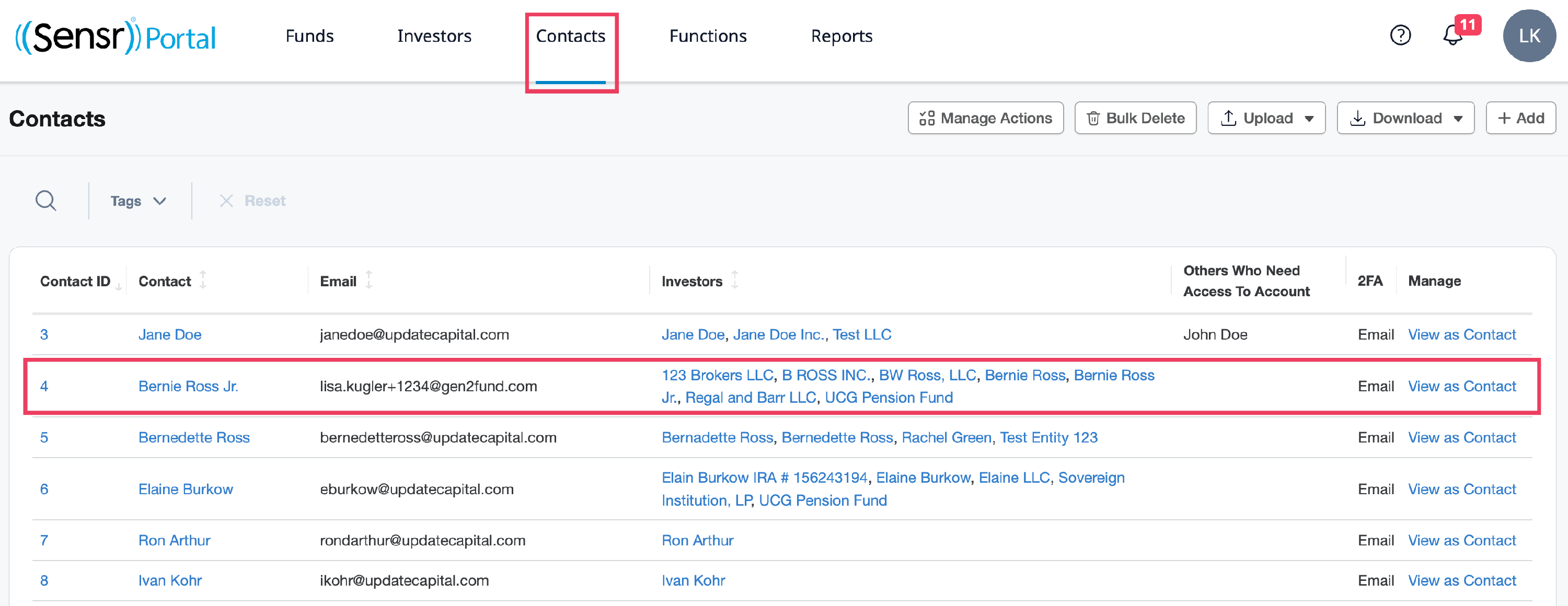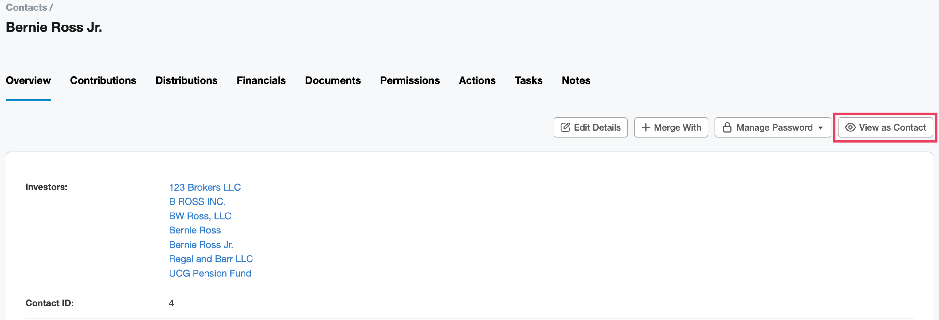 In many cases, you will want to view the experience of your contacts. This includes understanding how an investor will be able to view their investments, distributions, and documents on the software. Or you may want to see the experience of a prospect who is viewing a current opportunity, committing capital, and signing their agreements within Sensr Portal.