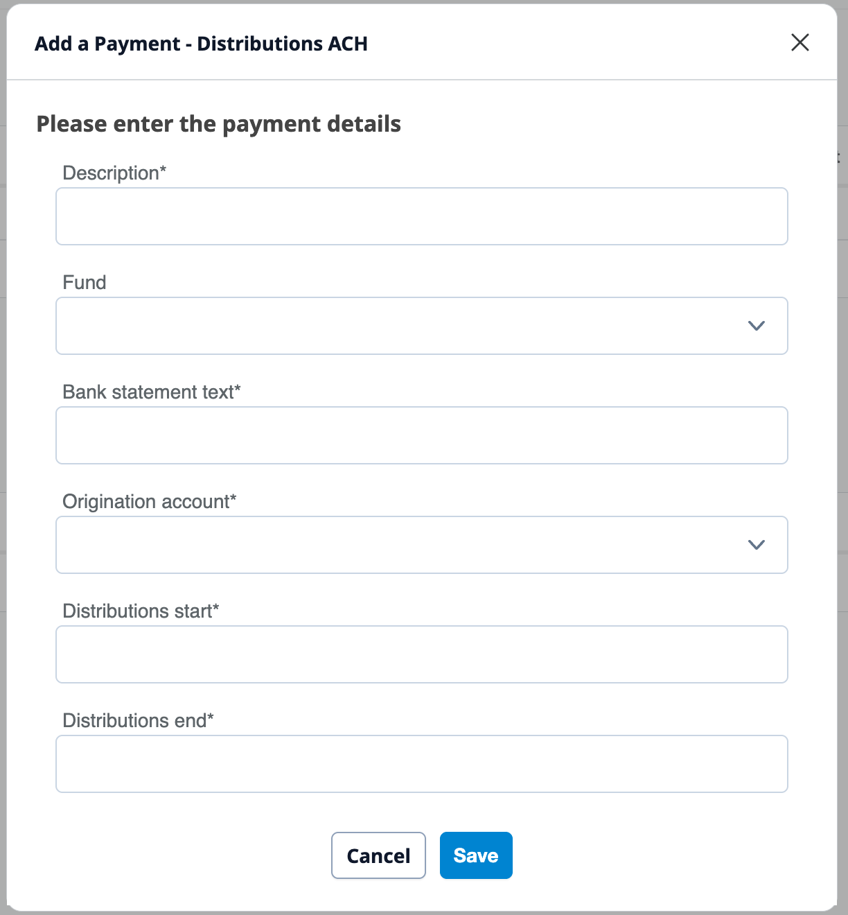 In the Add a Payment - Distributions ACH popup, enter the required details and click Create Payment