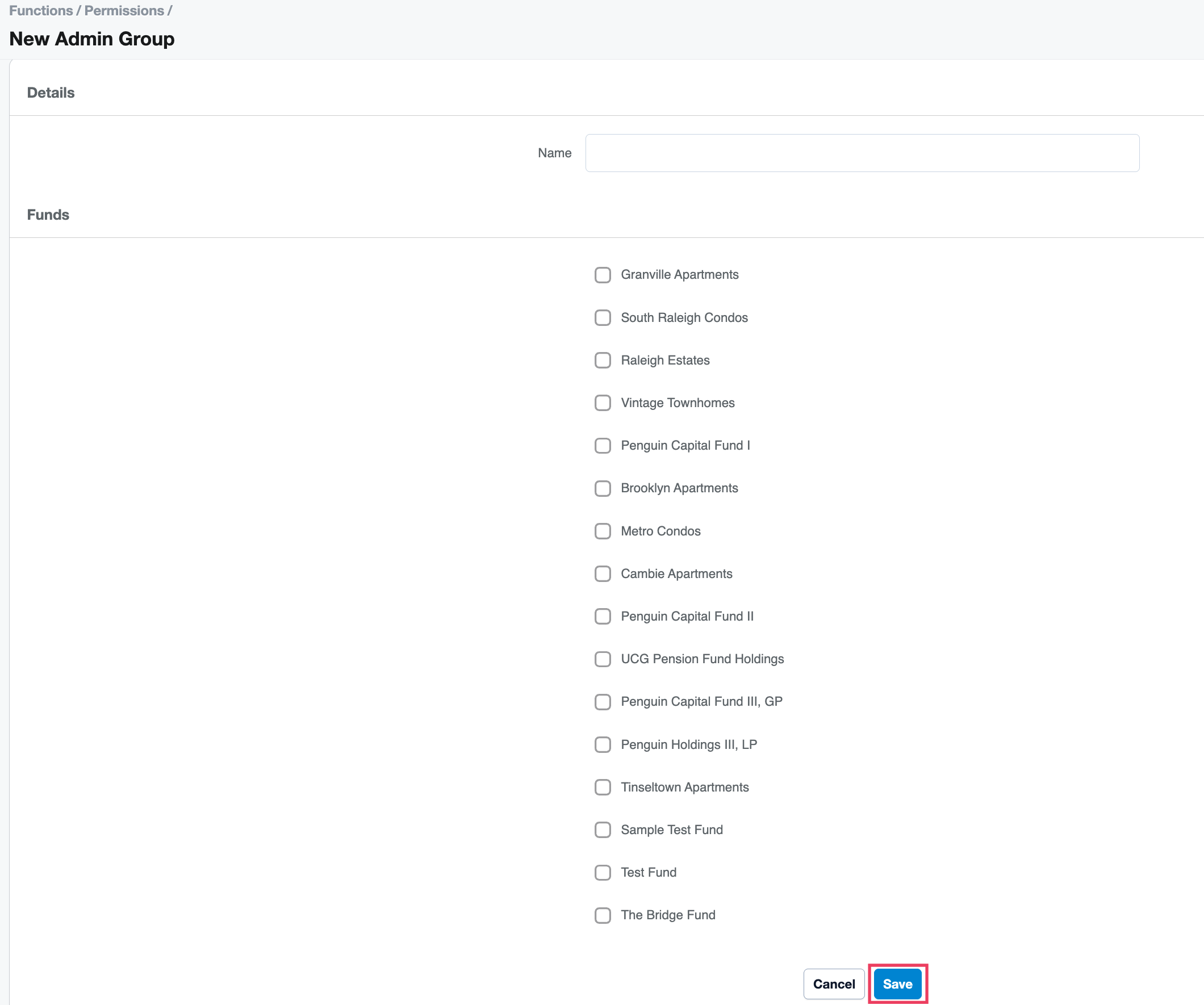 - On the details page enter the Admin Group name and select which funds the group should have access to. Click Save.