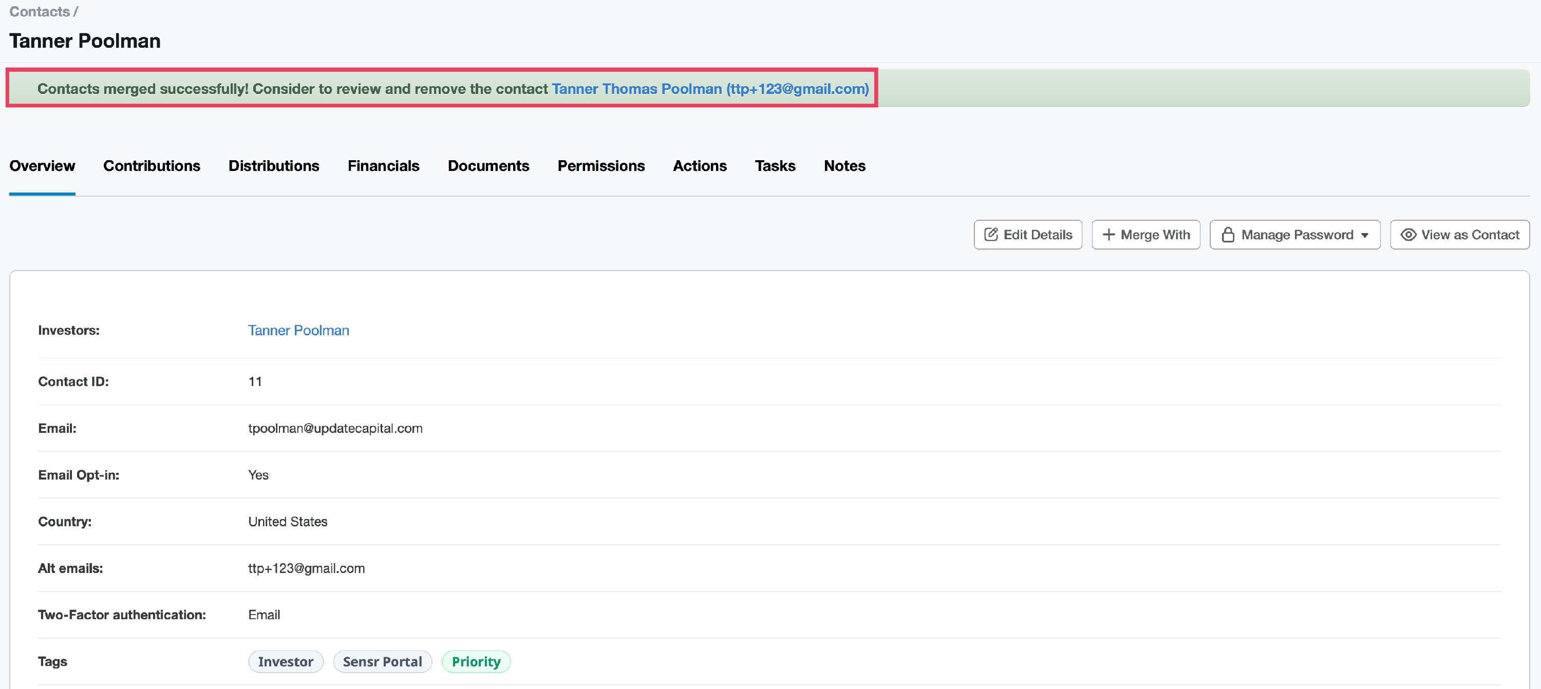 - At this point, all investments and entities belonging to the merged contact will be migrated to the primary contact, and the merged contact email will be added as an alternate email to the primary contact you merged into.