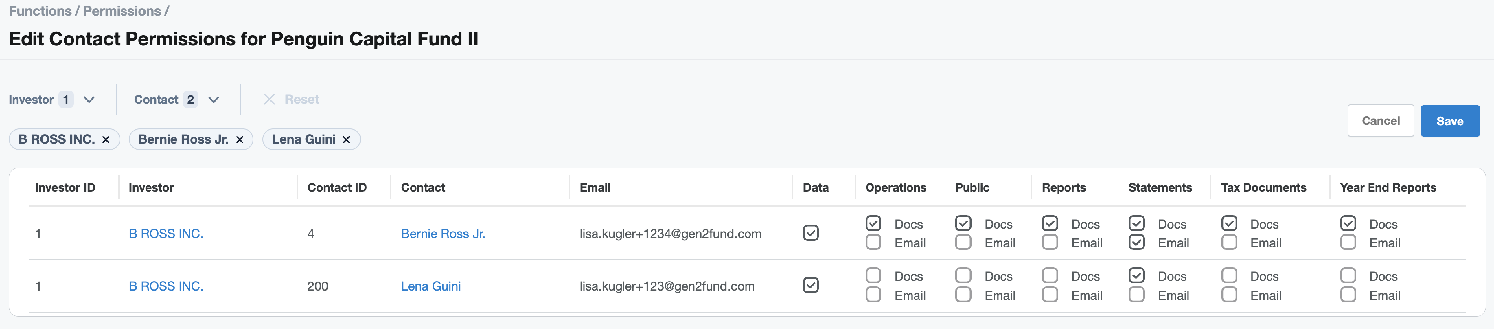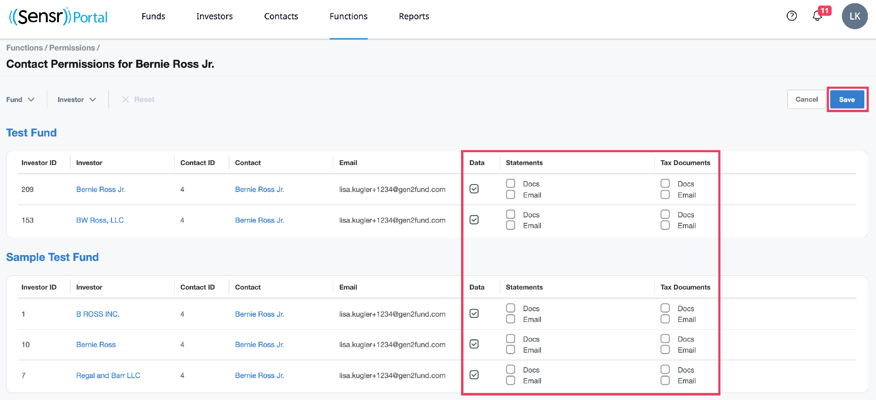 Use the checkboxes to determine if the contact will have data, document and/or email permissions for the folder of the related fund. Click Save.