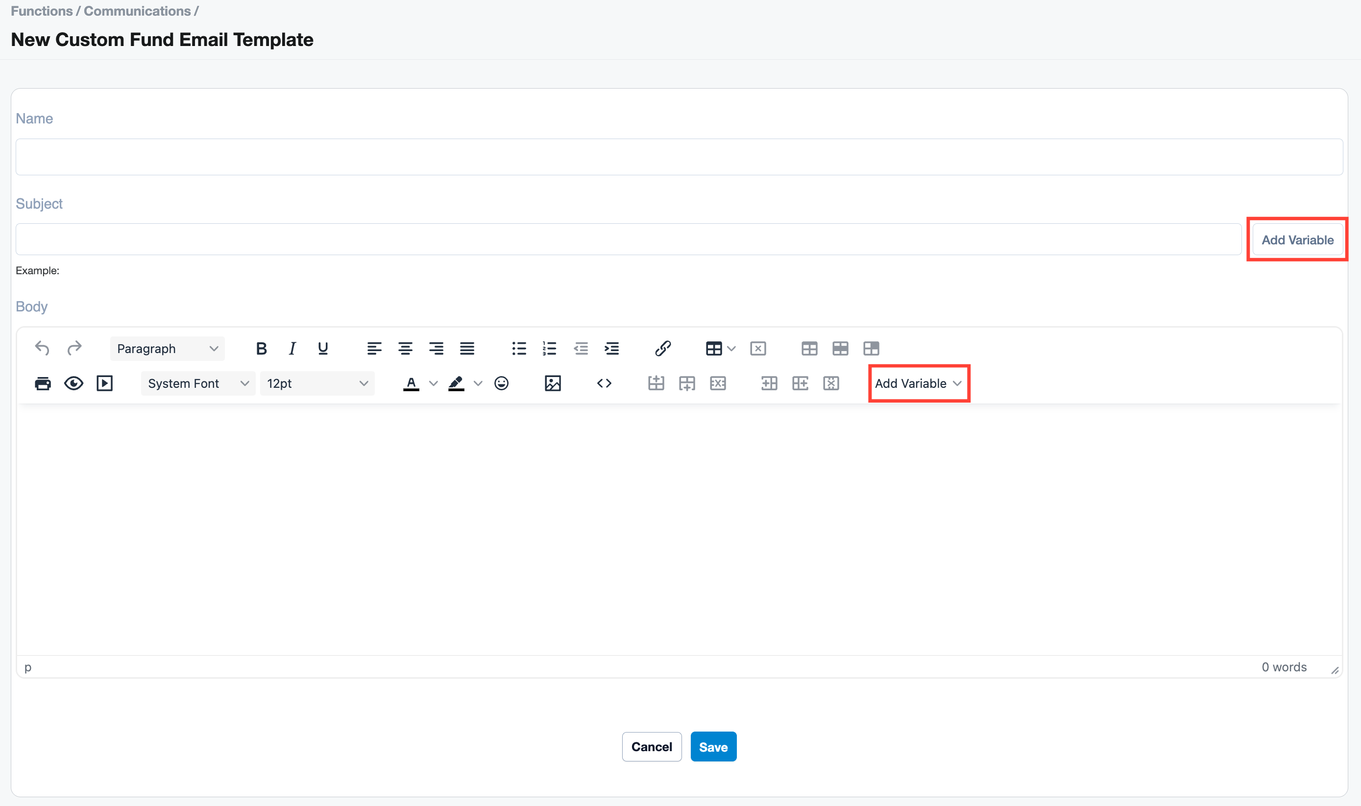 - Use the Body section to customize and create a new template. You can also use the Add Variable menu to include Fund, Investor, Contact.