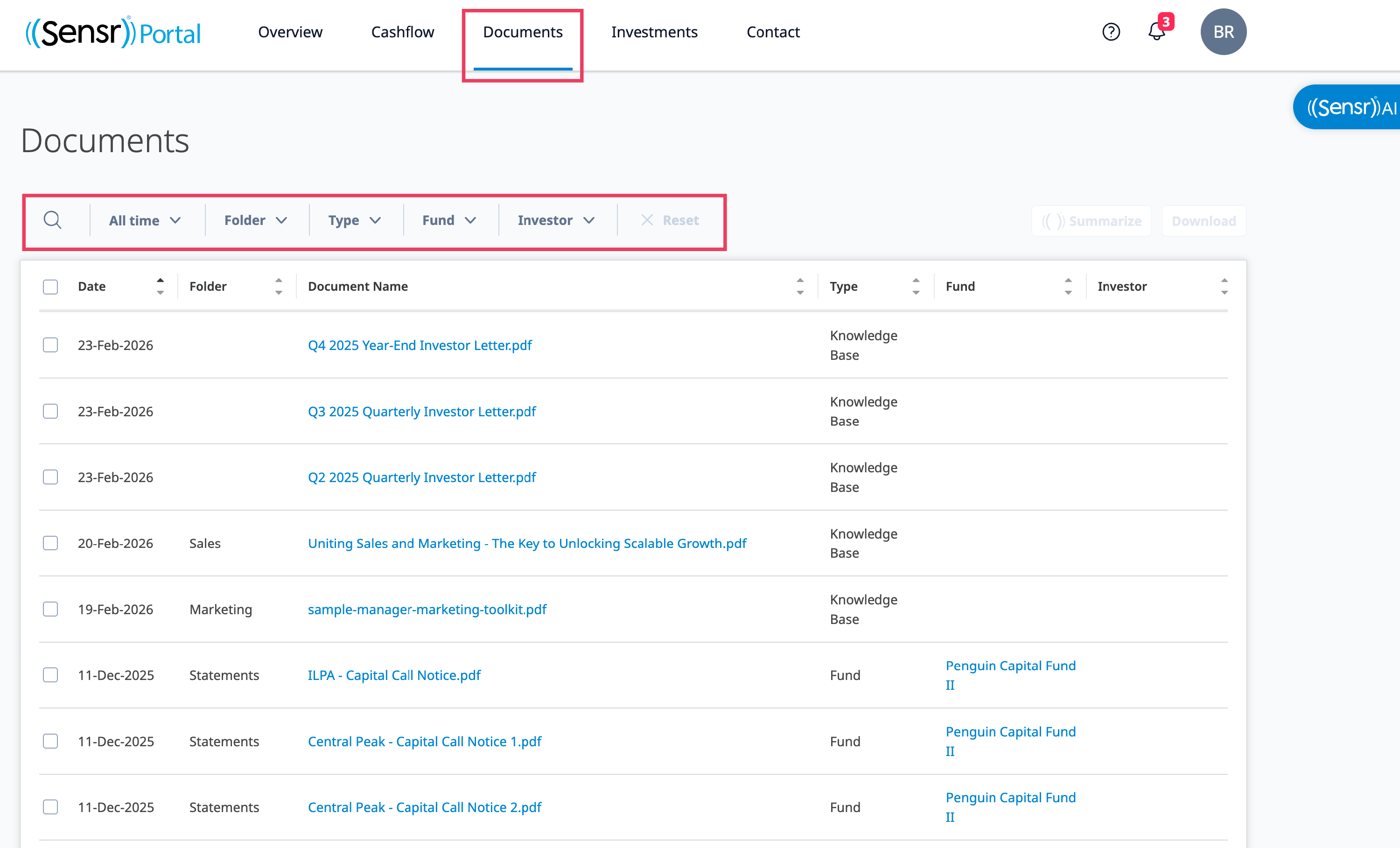 - Type - By default, the table displays all documents. Use the checkbox to make your type selections: Fund, Investor, Personal.