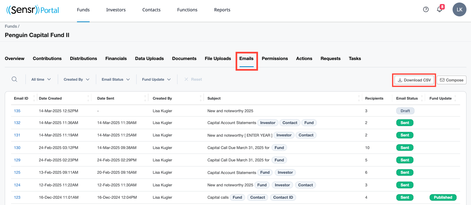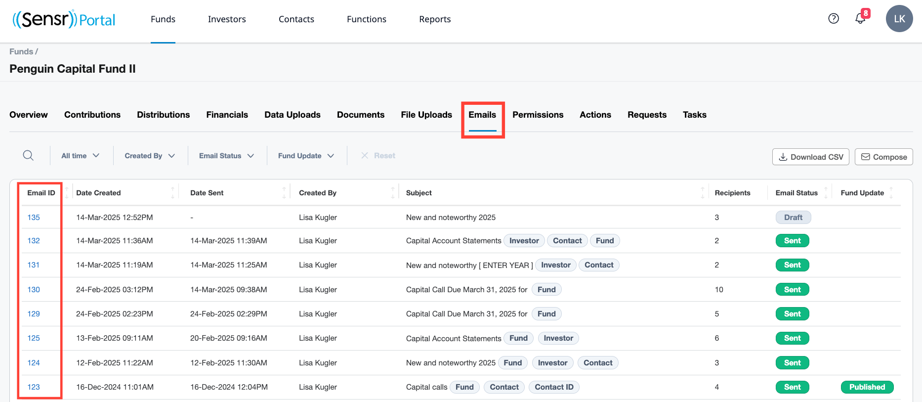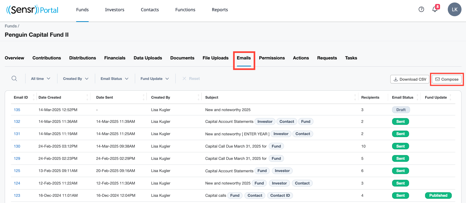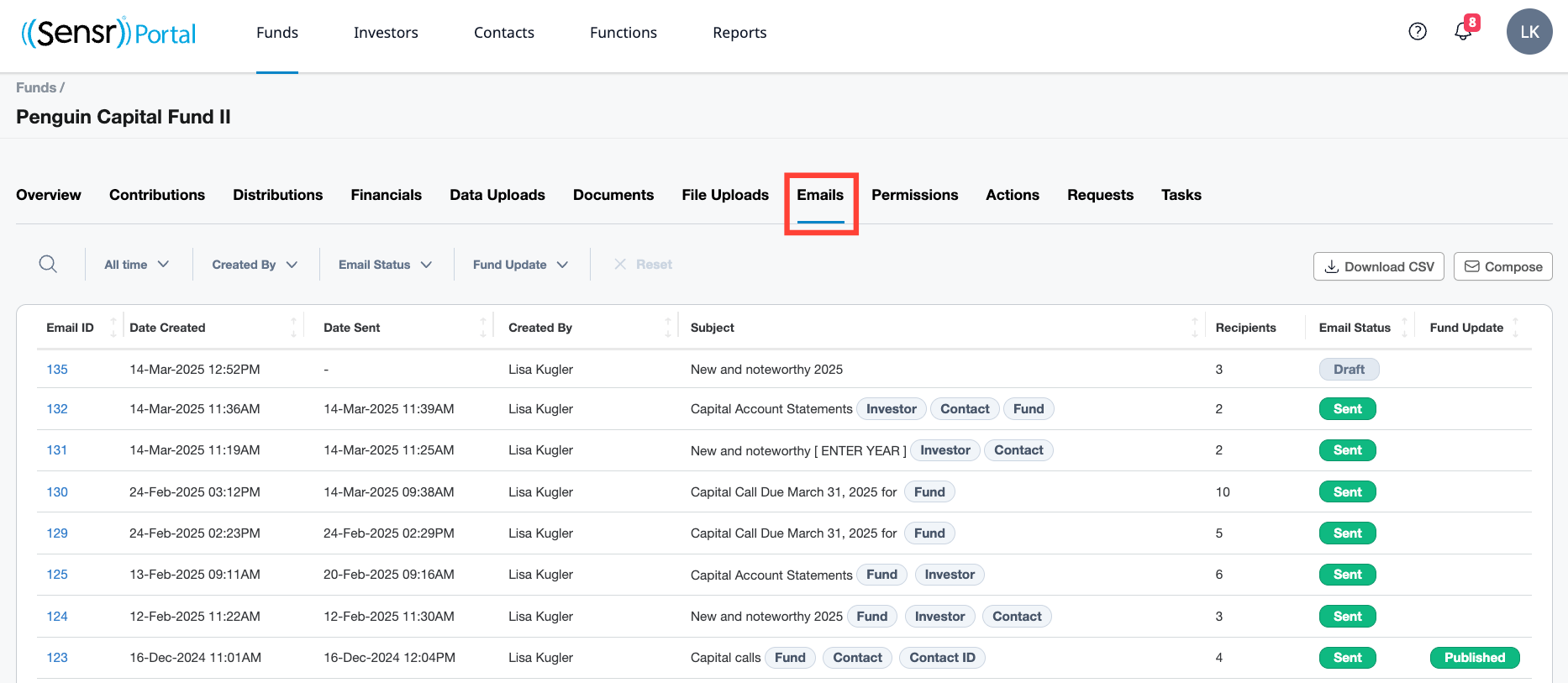 The Emails tab displays all existing emails for the related fund. Here you can view, edit and delete emails that have been drafted, published and sent to users. You can also download a list of emails as well as compose new emails.