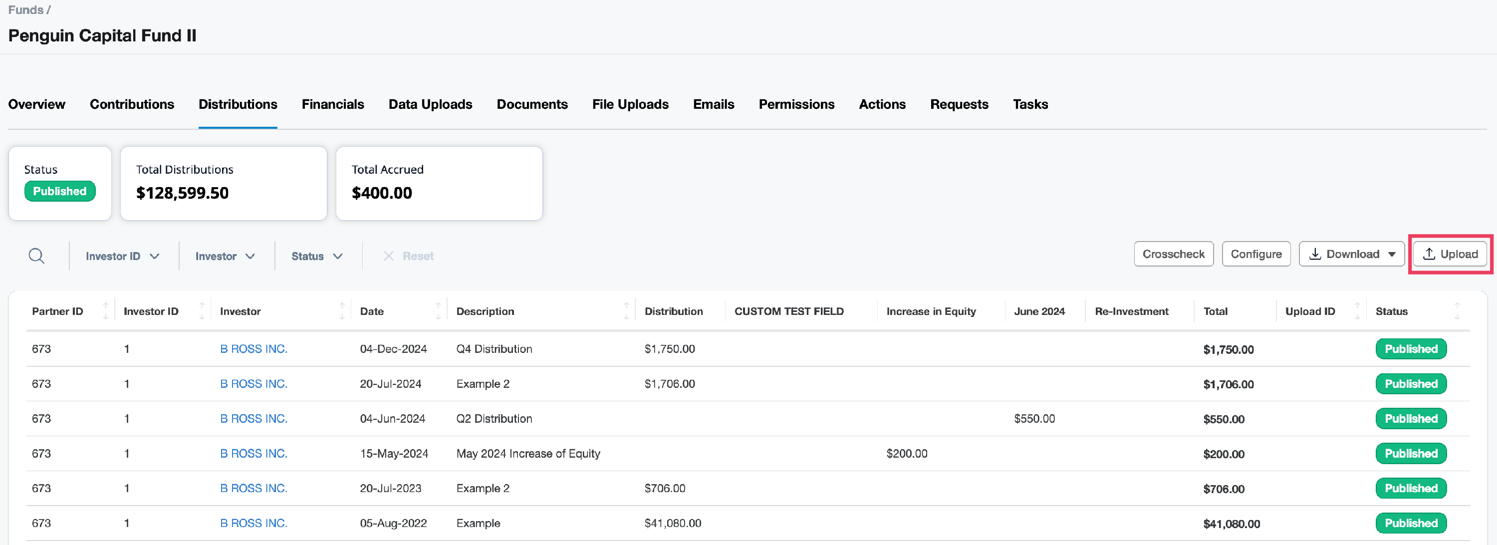 - Return to the Distributions tab on the Funds page for the related fund and click on Upload.