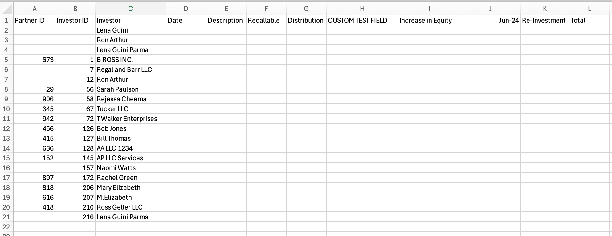 - There will be a row for every single investment. For example, some fields may have duplicate investor IDs for the same investor who has invested under multiple entities.