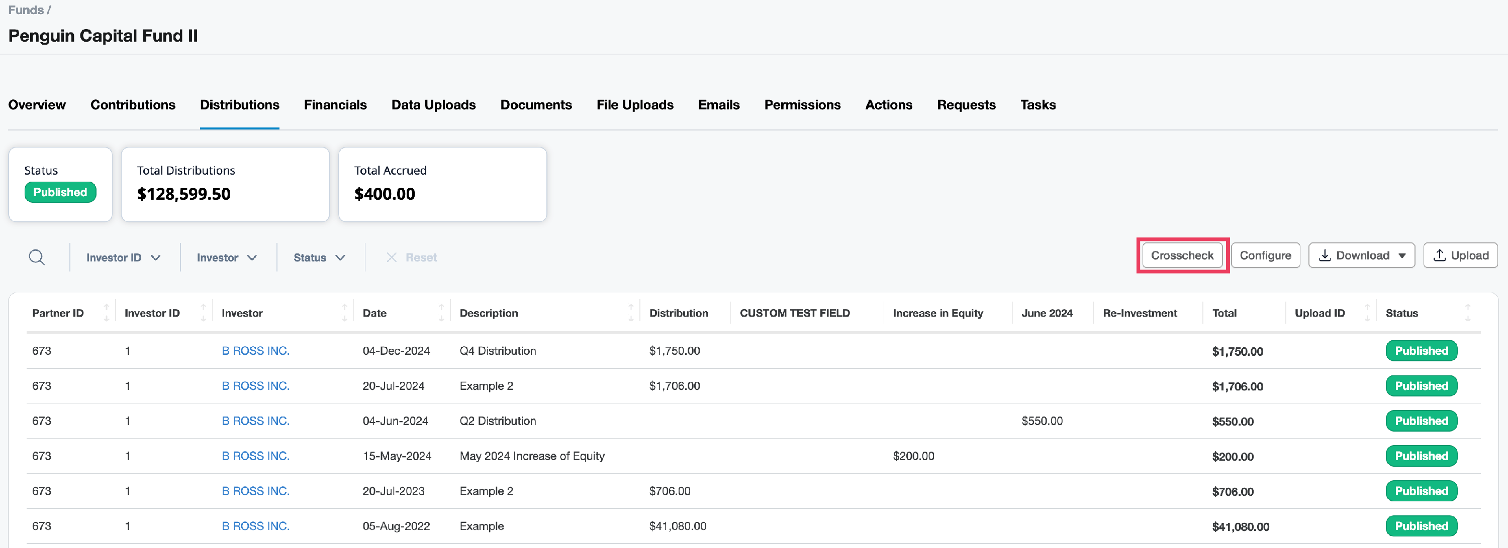 Once you are ready to import the batch of distributions use the Crosscheck button to see a summary of all the investor distribution totals made to date on the distributions tab and the most recent dated distribution event totals.
