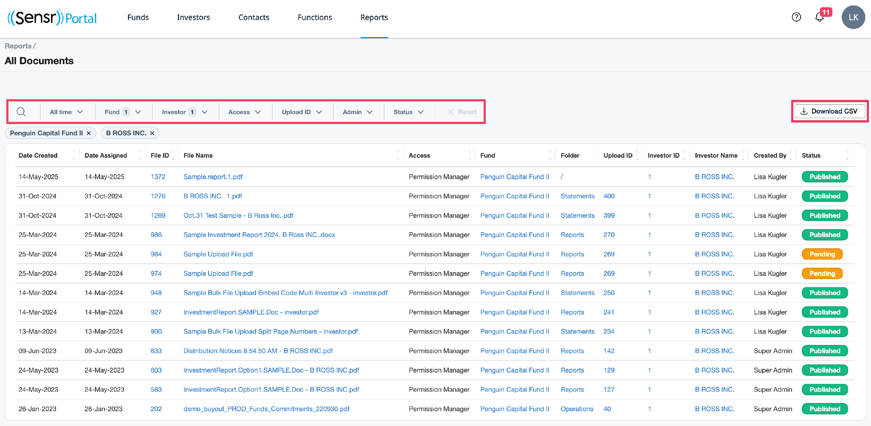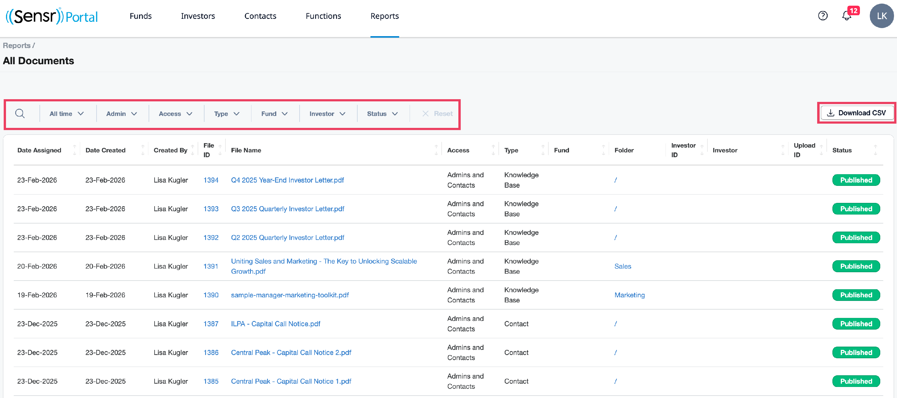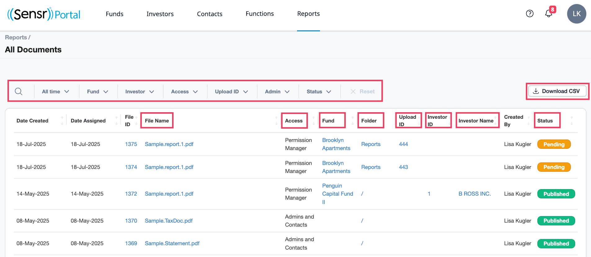- Download CSV - Documents can be downloaded in CSV format as needed and reflect the search and filters applied to the report.