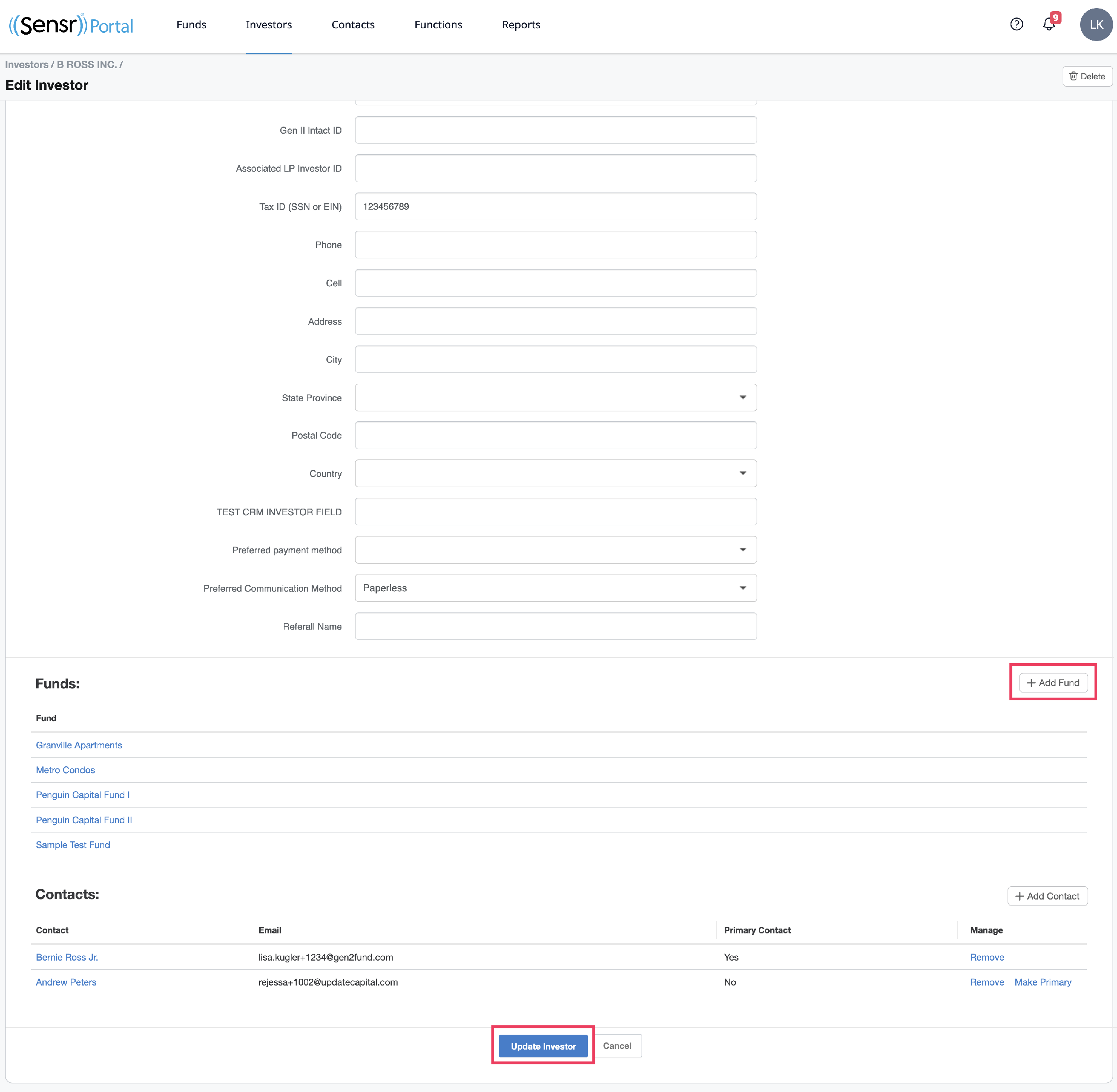 Use the Edit button to open all edit options. This includes the ability to click +Add Fund to open a single select dropdown menu with search featuring all the funds the investor isn’t already associated with. Once a fund is selected it will be assigned to the investor with ZERO commitment. Be sure to clikc Update Investor at the bottom of the page once all modifications are complete.