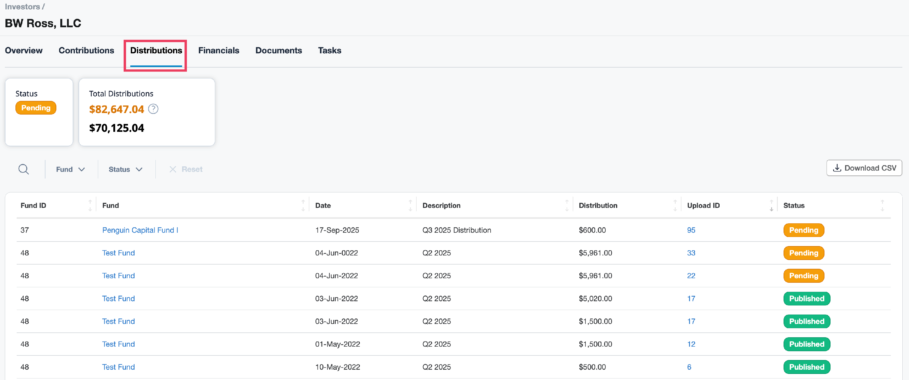 On the Distributions tab, you can view all the investor's available distribution information for the related funds. This includes any pending data and pending amounts indicated above the table as well as in the Status column. Filter by Fund and Status or use the search to view distributions as well as download a CSV of all distributions.