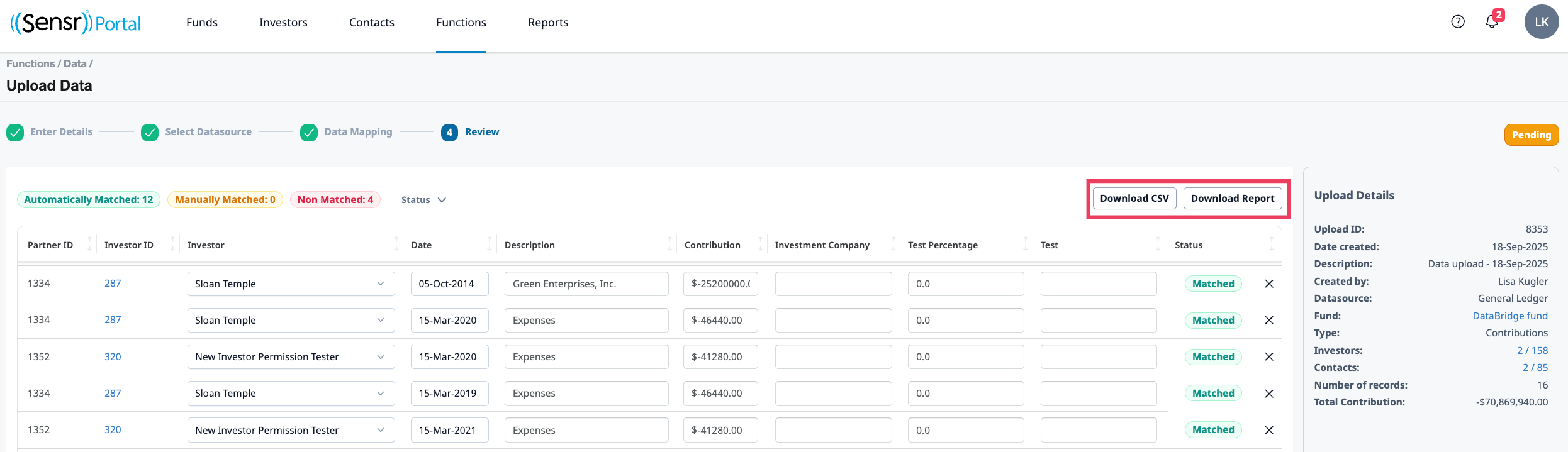Use the Download CSV to compare the source file to verify it matches. Or, use the Download Report button to review the PDF summary of the entire data upload, including investor and contact counts.