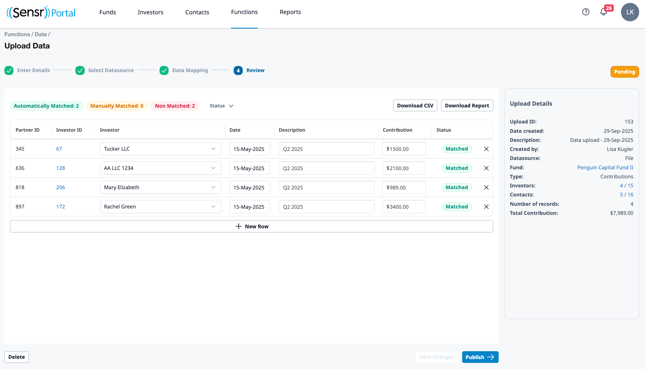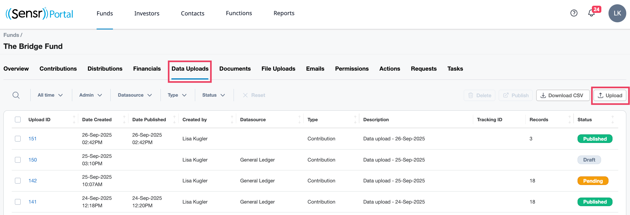 The Data Wizard offers an intuitive workflow for admins to upload Contribution, Distribution and Financial data on the Fund Details Page: Data Uploads Tab. The Data Wizard is also accessible via the Functions: Data page. Click the Upload button to launch the wizard in either pathway. Data is first uploaded with a Pending status before being validated and published.