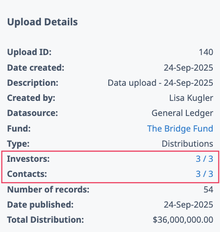 Be sure to review the Upload Details section for Investors and Contacts counts which appear on Step 2: Upload File and onwards. Ensure that the investor and contact counts match investor / contact permissions. Click on the link to navigate to those pages.