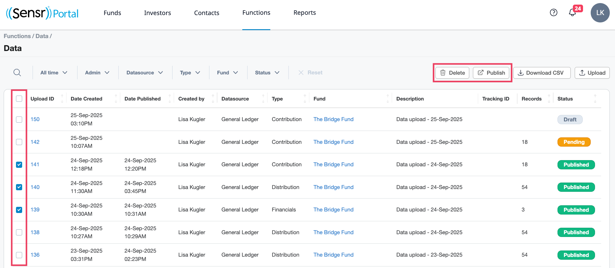 Admins can use the checkbox column to select one or more data uploads to bulk publish or bulk delete. Use the available filters to locate a specific data upload. By default, the Delete and Publish buttons are disabled until at least one data upload is selected.