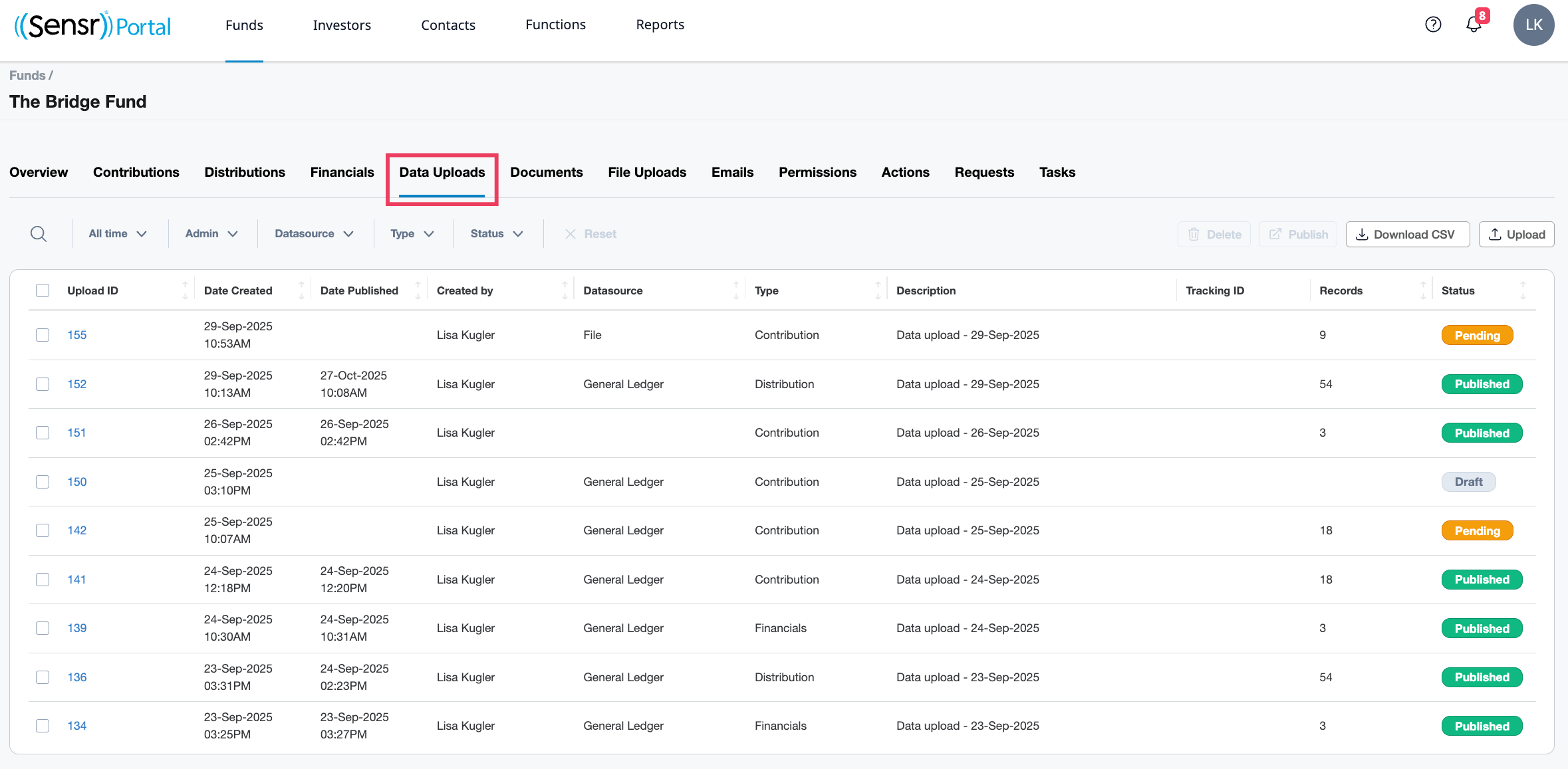 The Data Uploads tab displays all data uploads for Contributions, Distributions and Financials for the related fund. You can perform various functions here, such as search sort and filter view based on Upload ID and status. The Upload button launches the Data Wizard.