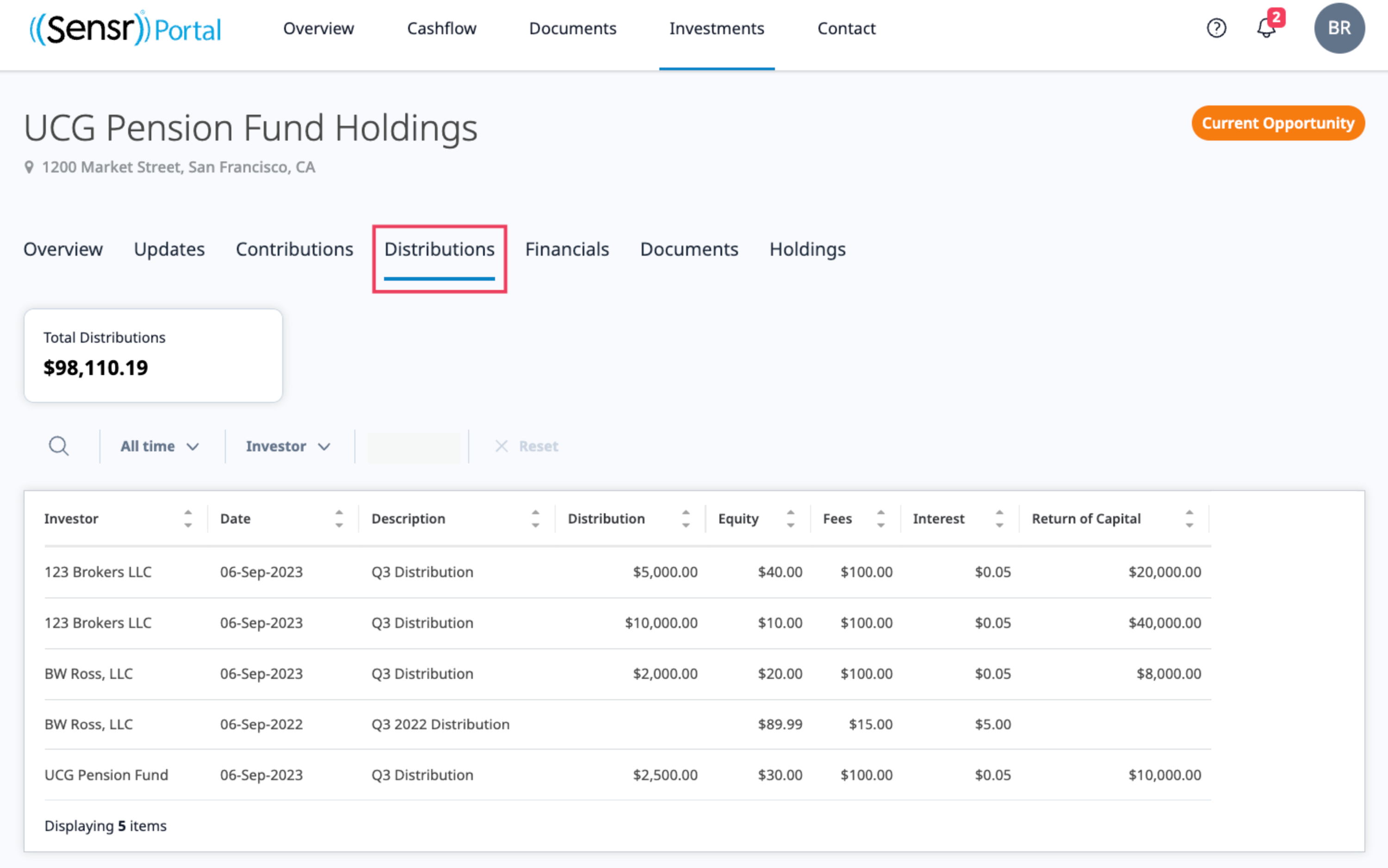 From the Investments page, you can click on the Fund name to view all related information organized in tabbed format. The Distributions tab includes all related distribution information. Use the available search and filters to locate a specific distribution.