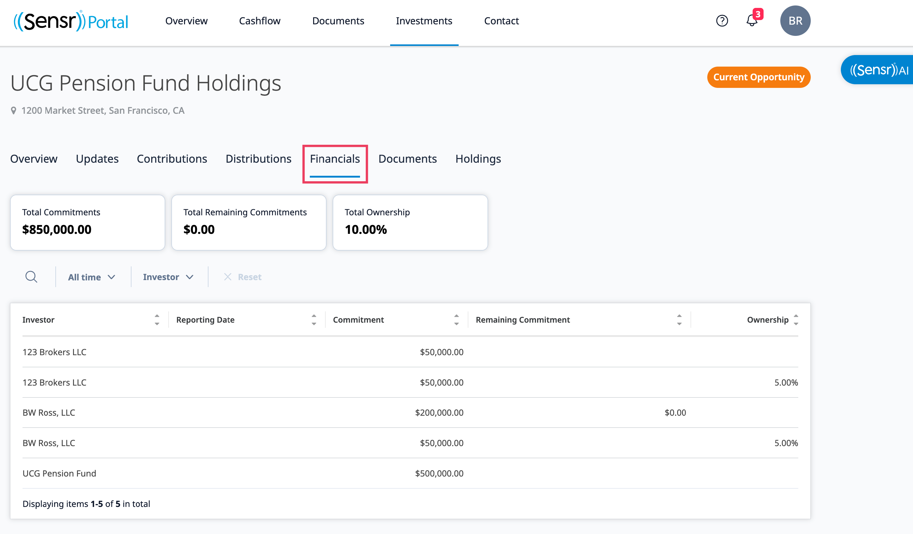 From the Investments page, you can click on the Fund name to view all related information organized in tabbed format. The Financials tab includes all related financial information along with ownership percentage. Use the available search and filters to locate specific financial information.