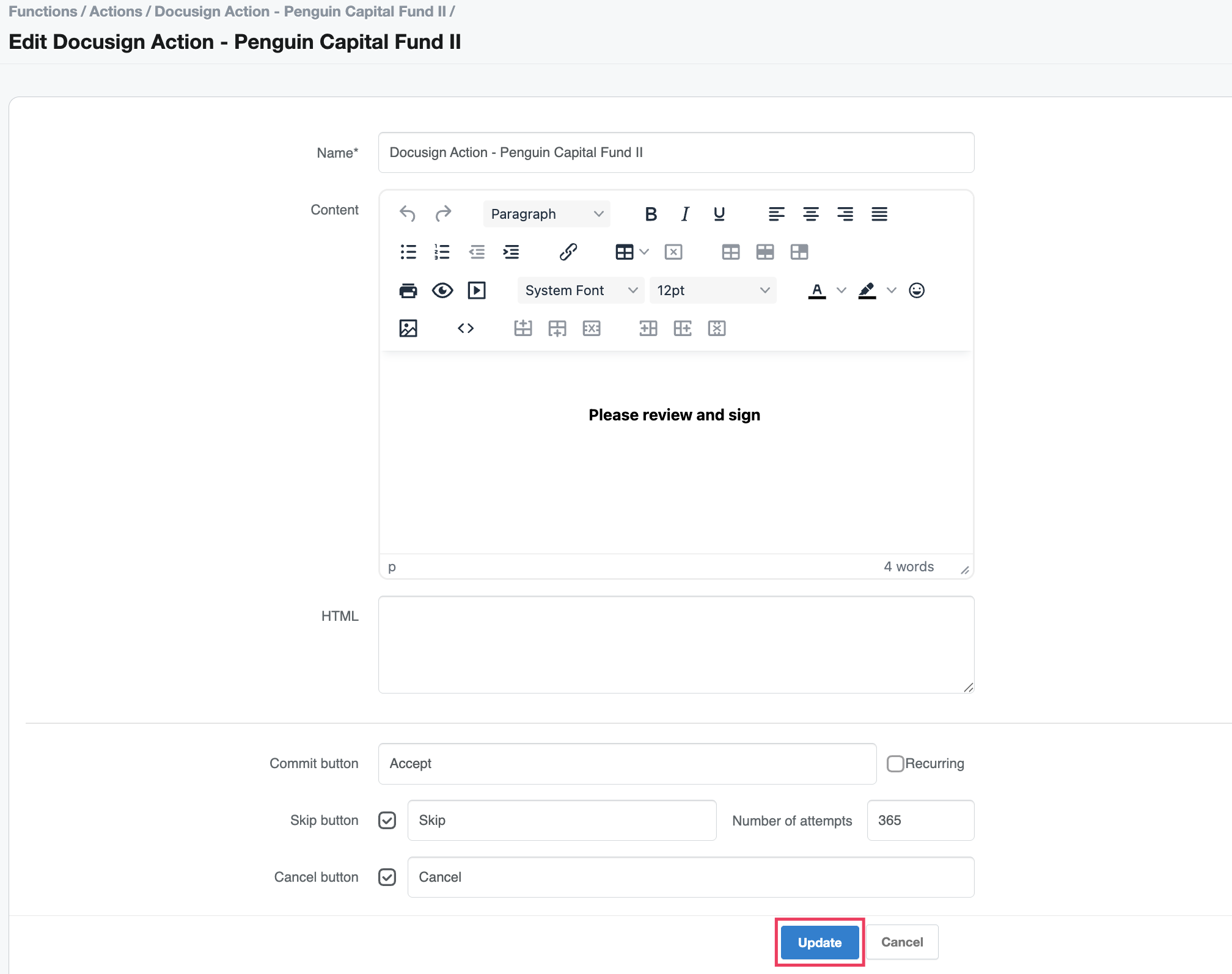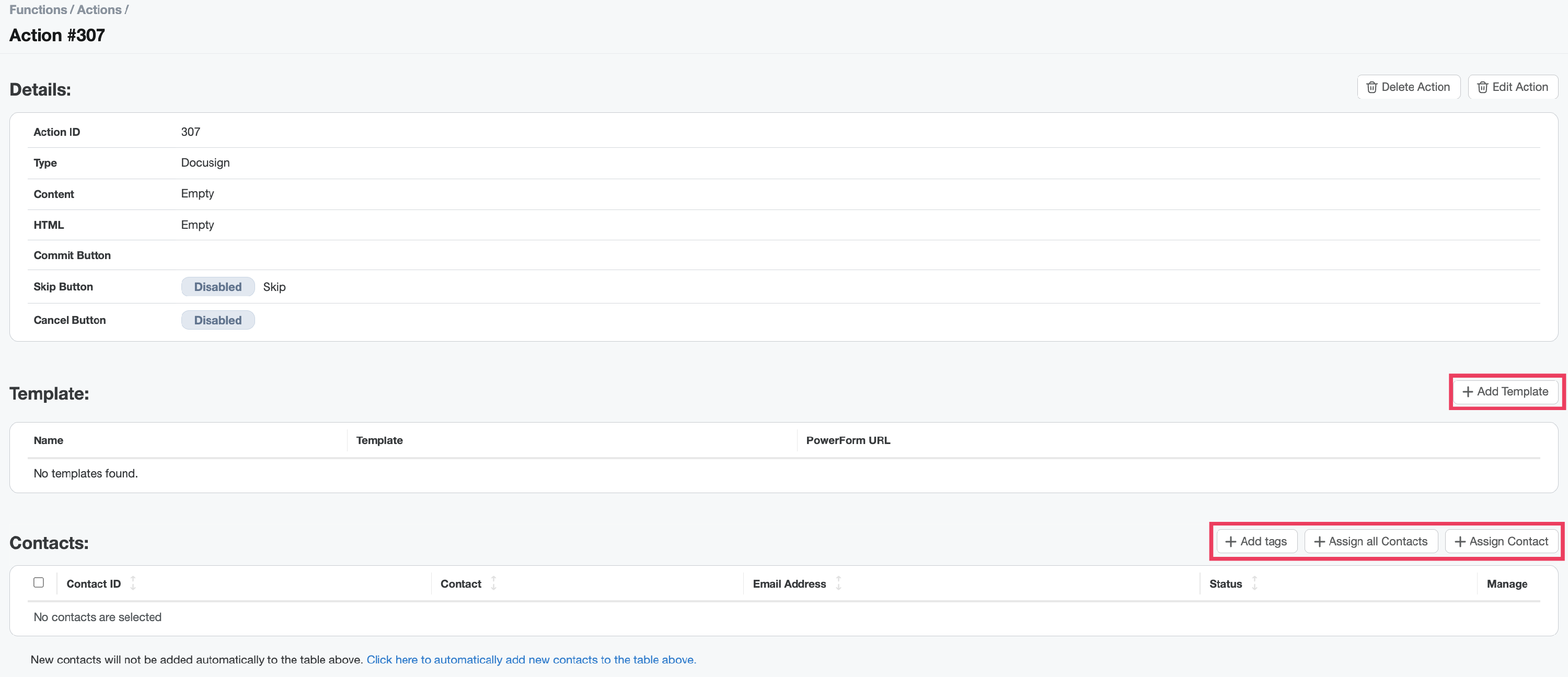 NOTE: Be advised, the system only allows one Docusign template to be added per action.